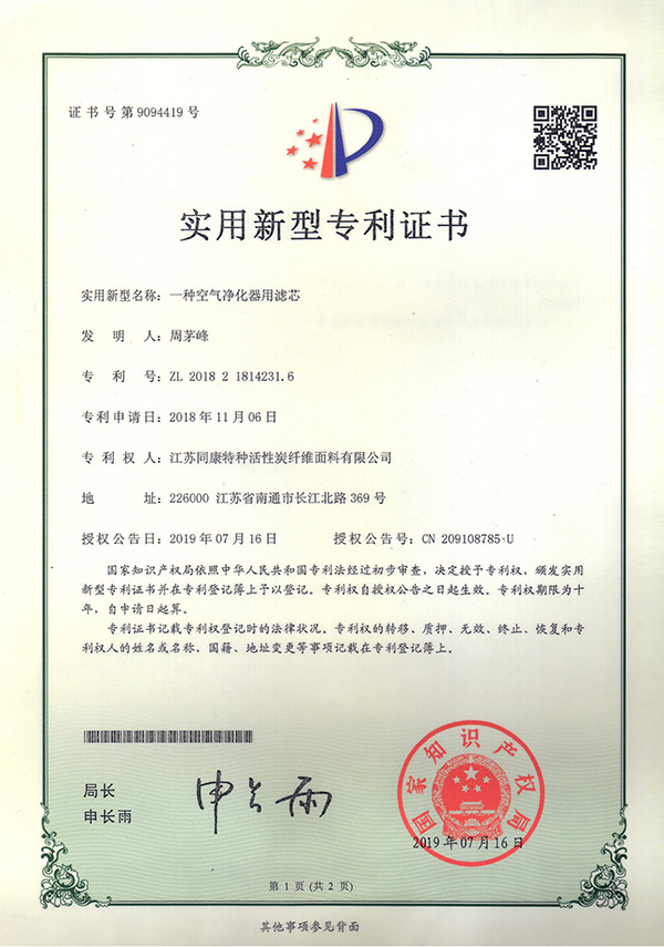 專利證書一種空氣凈氣器濾芯